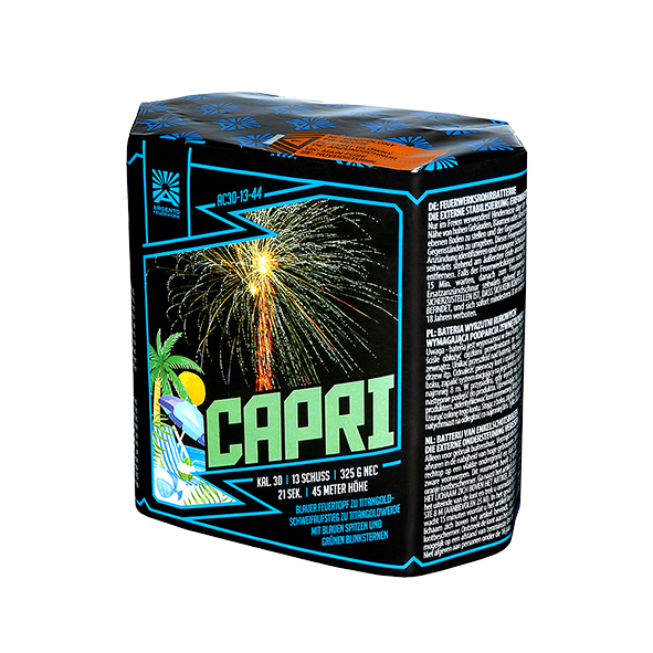 13 Schuss Batterie im Kaliber 30mm. Blauer Feuertopf zu Titangold-Schweifaufstieg zu Titangoldweide mit blauen Spitzen und grünen Blinkstern