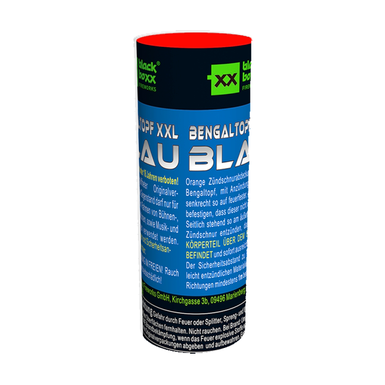 Blauer Bengaltopf mit intensiv leuchtender Farbe und minimaler Rauchentwicklung.